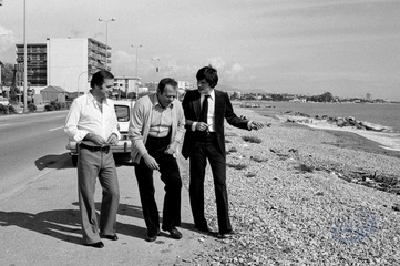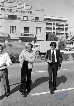 Alain Delon sur le tournage du film "Comme un Boomerang" réalisé par José Giovanni à Nice aux Studios de la Victorine avec des extérieus dans le quartier des Moulins, en mars 1976, ici au Palais de Justice avec Maitre Pasquini qui , en tant qu'avocat