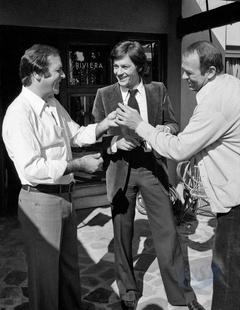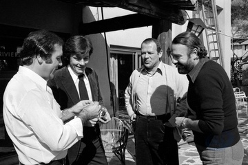 Jean Yanne, Alain Delon et Renato Salvatori sur le tournage du film Armaguedon réalisé par Alain Jessua, à Cagnes sur Mer en 1976