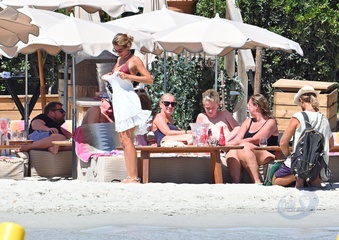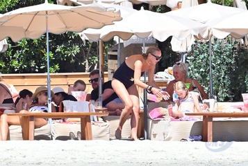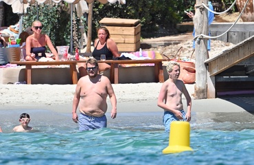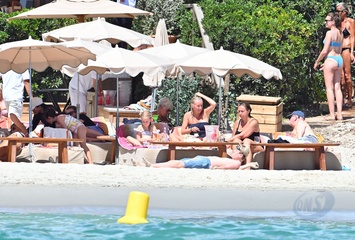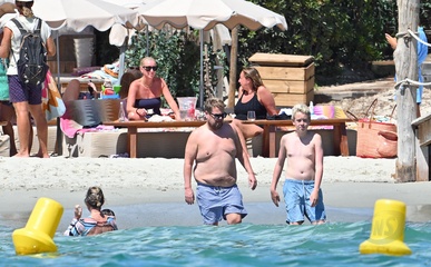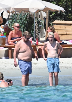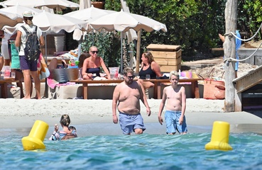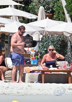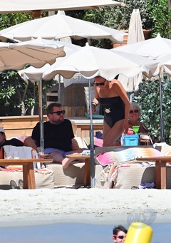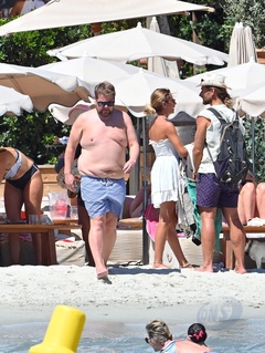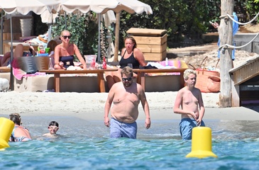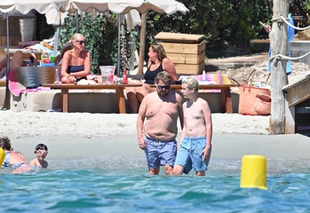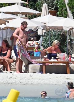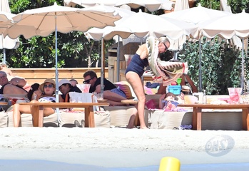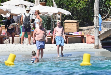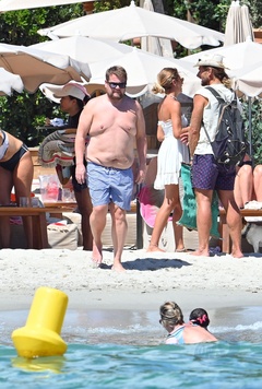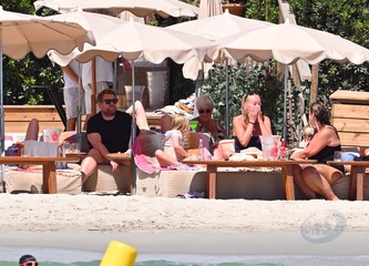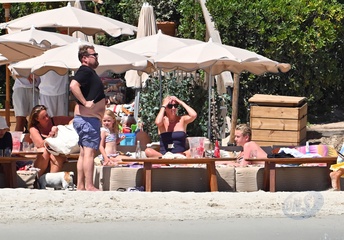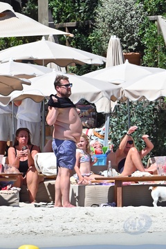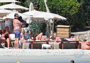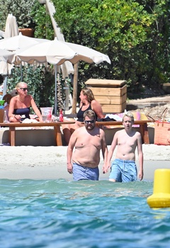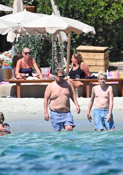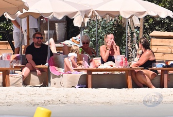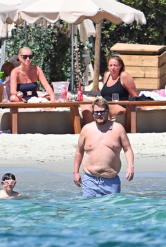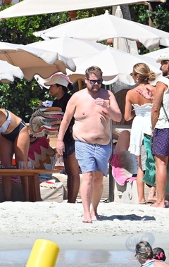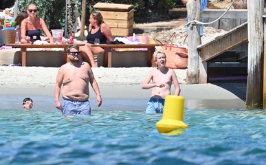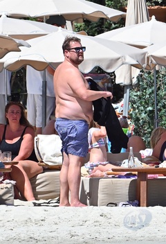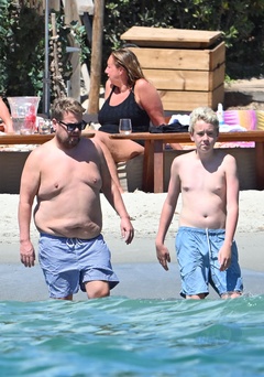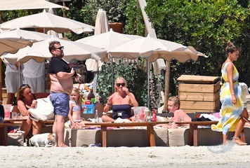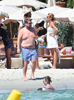 Exclusif - James Corden, sa femme Julia Carey et leur fils Max et des amis à la plage à Saint-Tropez