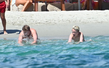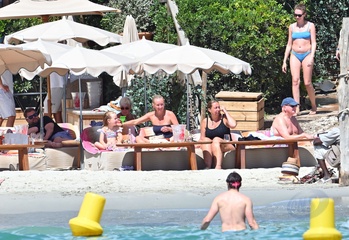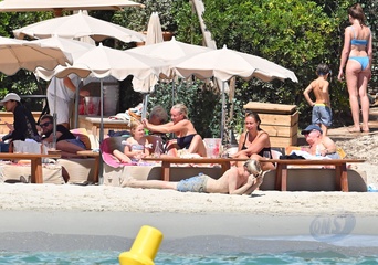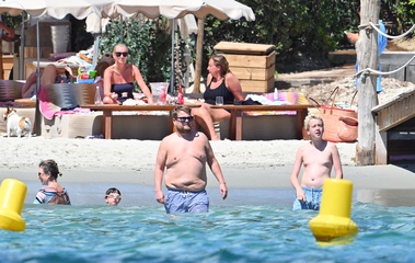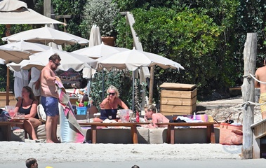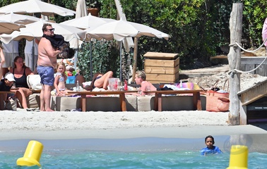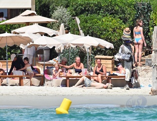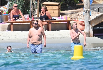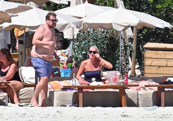 James Corden, jego żona Julia Carey i ich syn Max oraz przyjaciele na plaży w Saint-Tropez