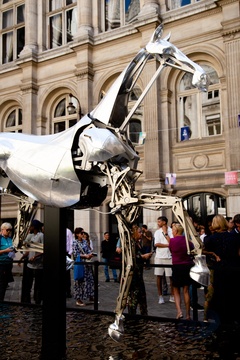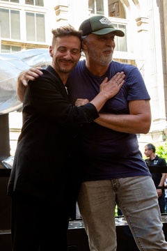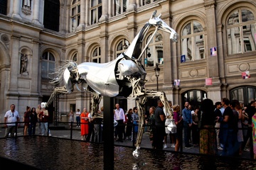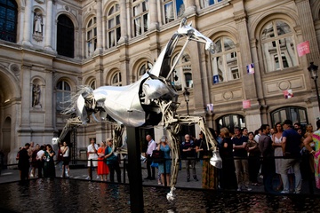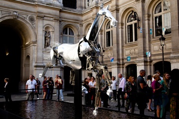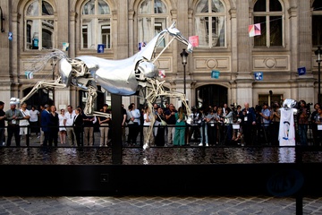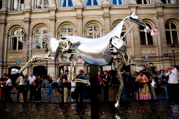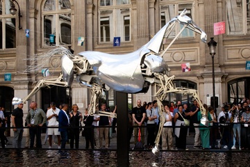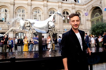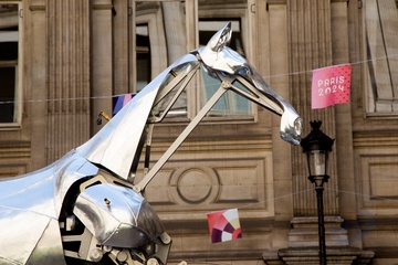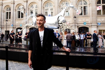 CB - Anne Hidalgo et Thomas Jolly lors de l'inauguration de l'exposition "Zeus / Ville de Paris", le cheval métallique de la cérémonie d'ouverture des Jeux Olympiques Paris 2024, à l'Hôtel de Ville de Paris
