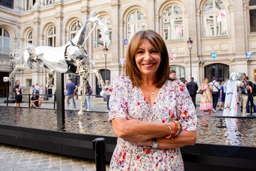 Anne Hidalgo i Thomas Jolly podczas inauguracji wystawy „Zeus / Miasto Paryża”, metalowego konia ceremonii otwarcia Igrzysk Olimpijskich Paryż 2024, w ratuszu Paryża 21