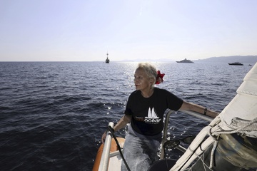 Agnès B. i jej załoga na pokładzie szkunera „Tara” w Antibes w ramach projektu prowadzonego przez Fundację Tara Océan