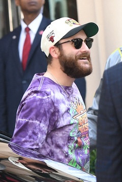 René-Charles Angélil, porte un t-shirt Outkast, et sa compagne Angelique Weckenmann arrivent à l'hôtel Royal Monceau à Paris