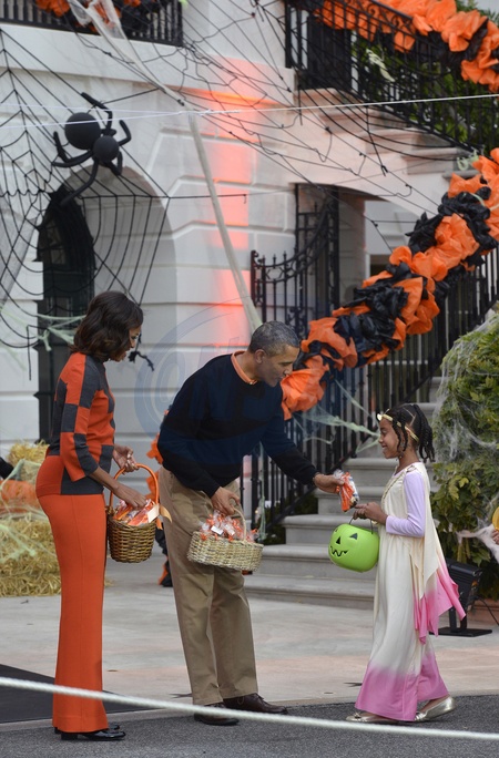 Prezydent USA Barack Obama rozdaje dzieciom cukierki przed South Portico, Washington