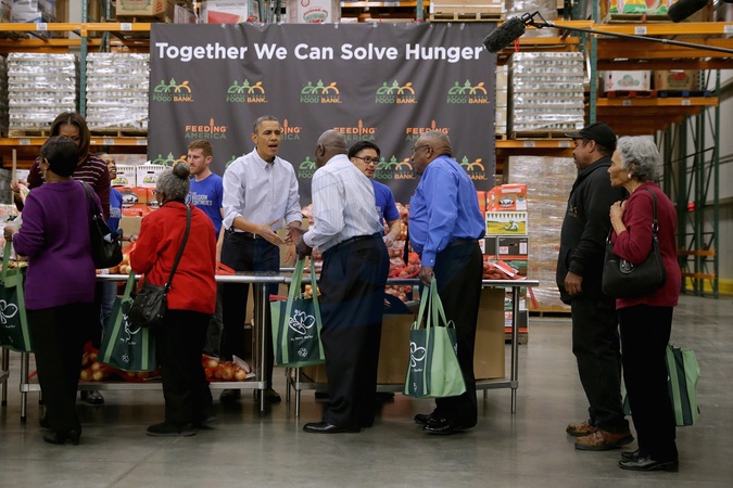 Prezydent Obama z rodzina pomagaja pakowac zywnosc dla najbardziej potrzebujacych, Washington