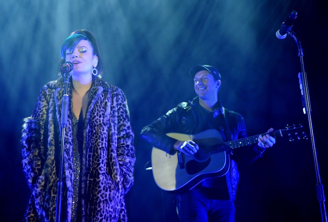 Lily Allen na scenie z Chrisem Martinem i Robbie Williamsem