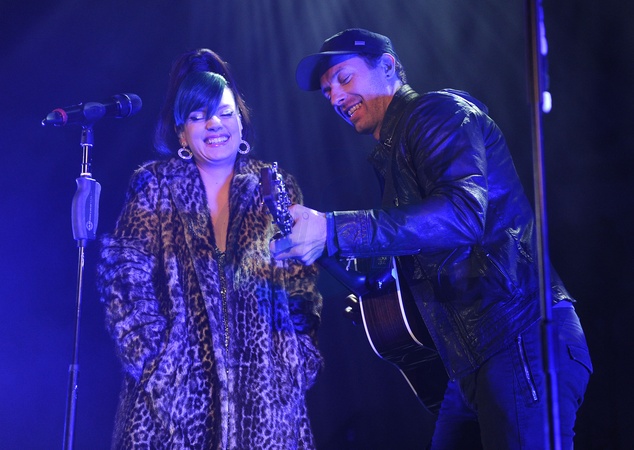 Lily Allen na scenie z Chrisem Martinem i Robbie Williamsem