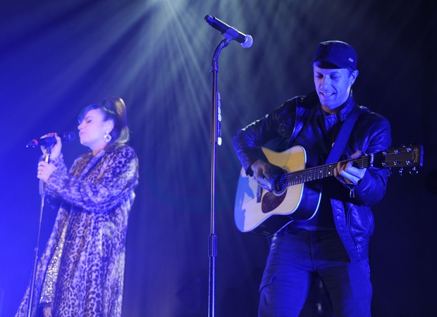 Lily Allen na scenie z Chrisem Martinem i Robbie Williamsem