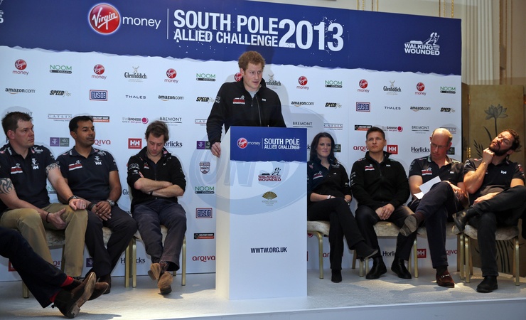 Ksiaze Harry na komferencji z uczestnikami Walking With The Wounded Virgin Money South Pole Allied