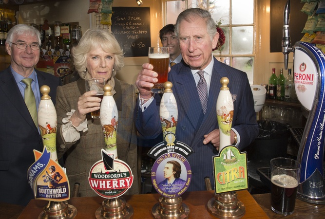Ksiaze Karol i Ksiezna Camilla pija piwo