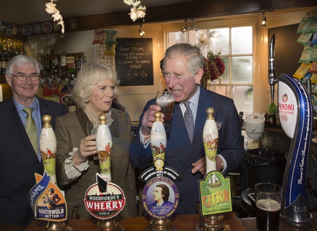 Ksiaze Karol i Ksiezna Camilla pija piwo