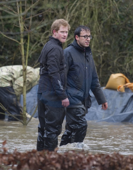 Ksiaze William i Harry ukladaja worki z piaskiem