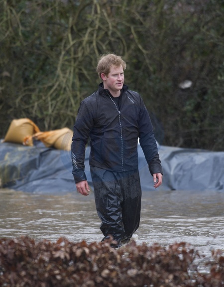 Ksiaze William i Harry ukladaja worki z piaskiem