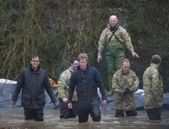 Ksiaze William i Harry ukladaja worki z piaskiem