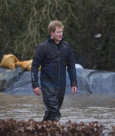 Ksiaze William i Harry ukladaja worki z piaskiem