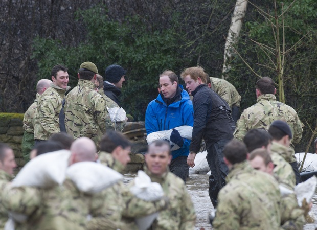Ksiaze William i Harry ukladaja worki z piaskiem