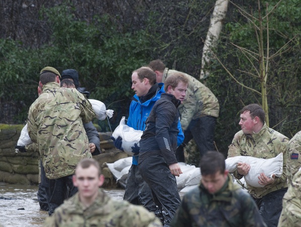 Ksiaze William i Harry ukladaja worki z piaskiem