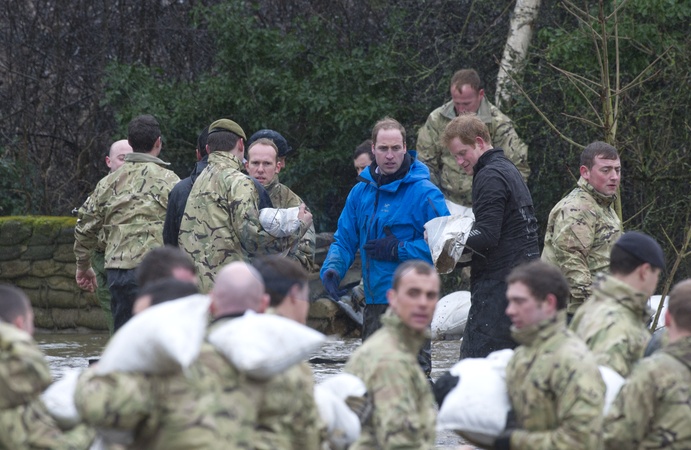 Ksiaze William i Harry ukladaja worki z piaskiem