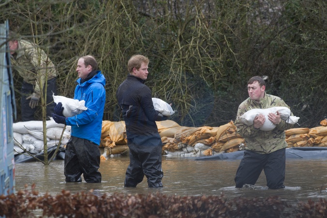 Ksiaze William i Harry ukladaja worki z piaskiem