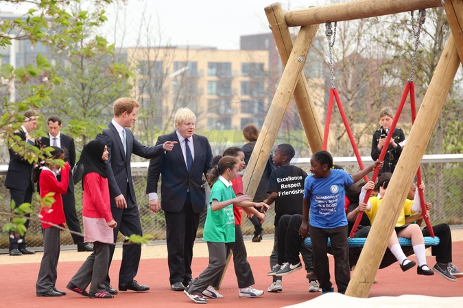 Ksiaze Harry i Boris Johnson spotkali sie z dziecmi w Parku Olimpijskim Queen Elizabeth