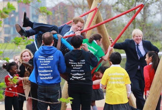 Ksiaze Harry i Boris Johnson spotkali sie z dziecmi w Parku Olimpijskim Queen Elizabeth