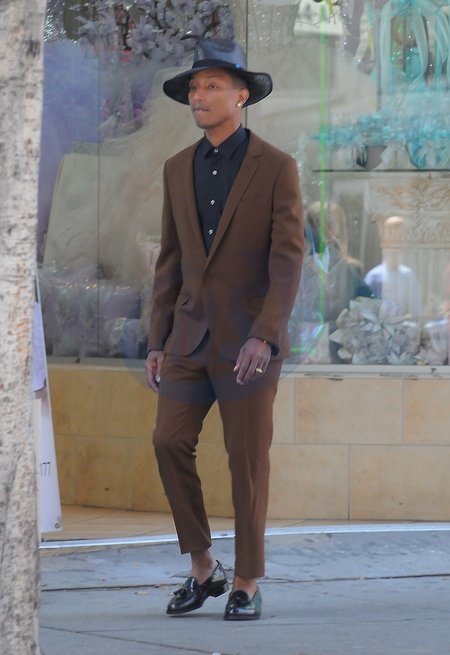 Pharrell Williams w nowym kapeluszu i za krotkich spodniach