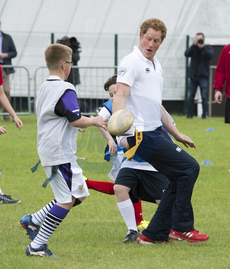 Ksiaze Harry gra z dziecmi w pilke nozna i rugby