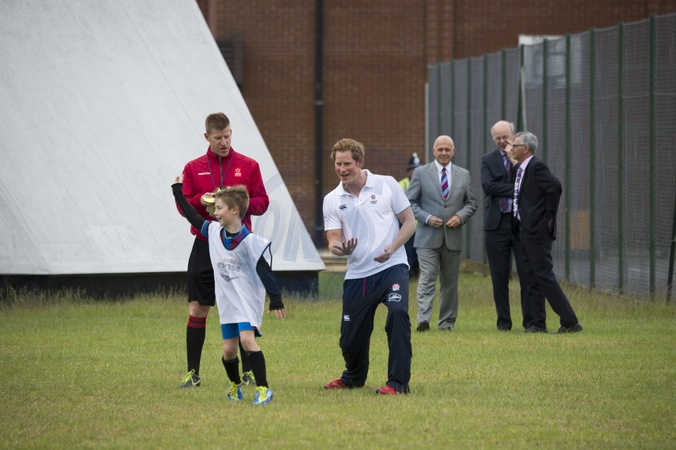 Ksiaze Harry gra z dziecmi w pilke nozna i rugby