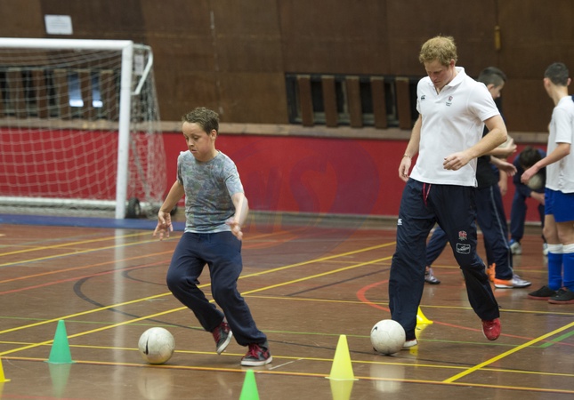 Ksiaze Harry gra z dziecmi w pilke nozna i rugby