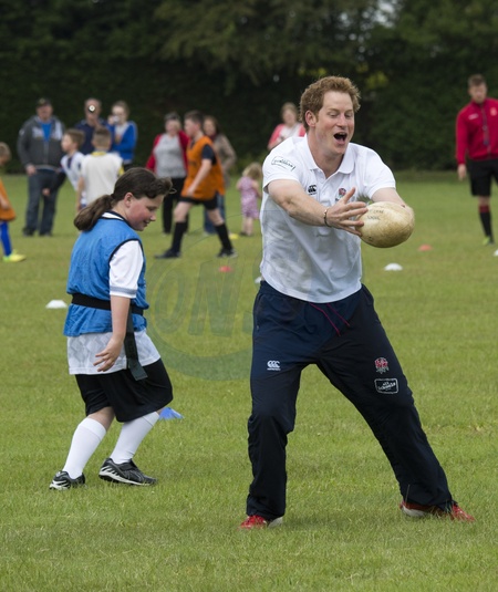 Ksiaze Harry gra z dziecmi w pilke nozna i rugby