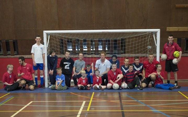 Ksiaze Harry gra z dziecmi w pilke nozna i rugby