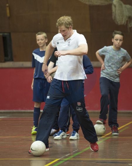 Ksiaze Harry gra z dziecmi w pilke nozna i rugby