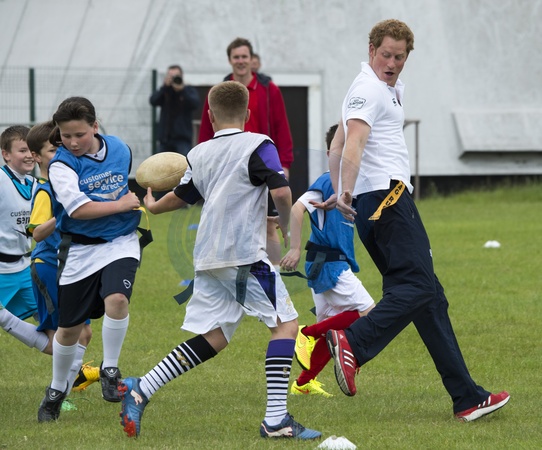 Ksiaze Harry gra z dziecmi w pilke nozna i rugby