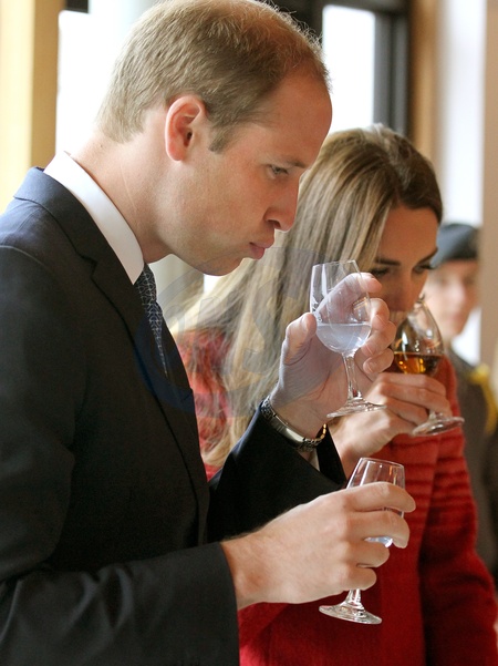 Ksiaze William i Ksiezna Kate degustuja whisky w Crieff, Szkocja