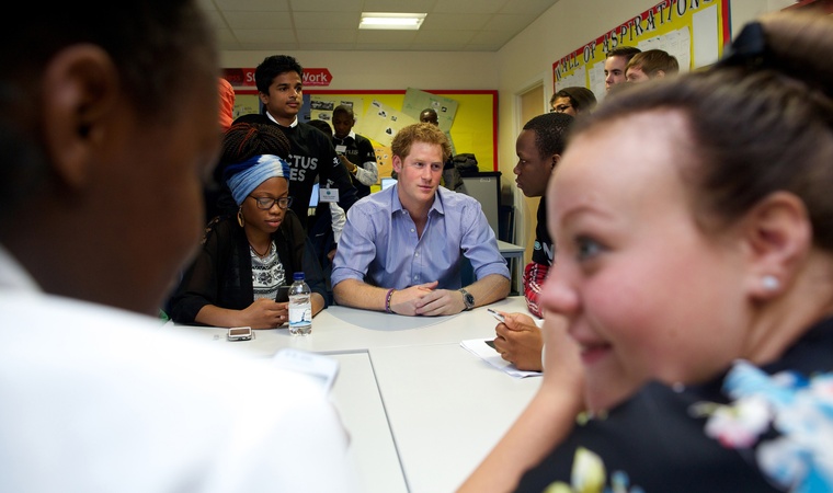 Ksiaze Harry podczas wizyty w Bethnal Green Academy
