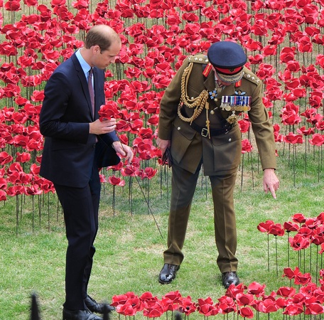 Ksiezna Kate, ksiaze William i ksiaze Harry wsrod ceramicznych makow przy zamku Tower