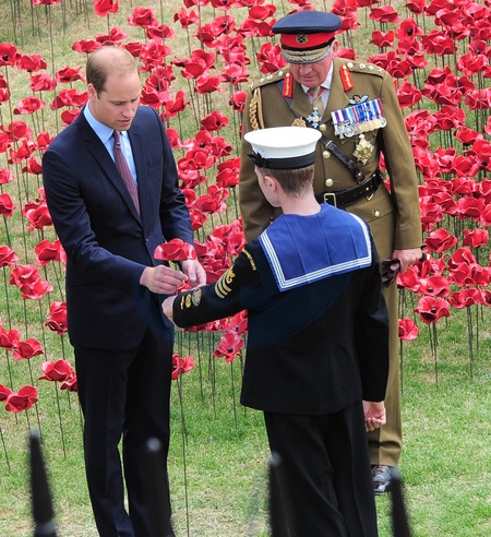 Ksiezna Kate, ksiaze William i ksiaze Harry wsrod ceramicznych makow przy zamku Tower