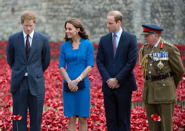 Ksiezna Kate, ksiaze William i ksiaze Harry wsrod ceramicznych makow przy zamku Tower