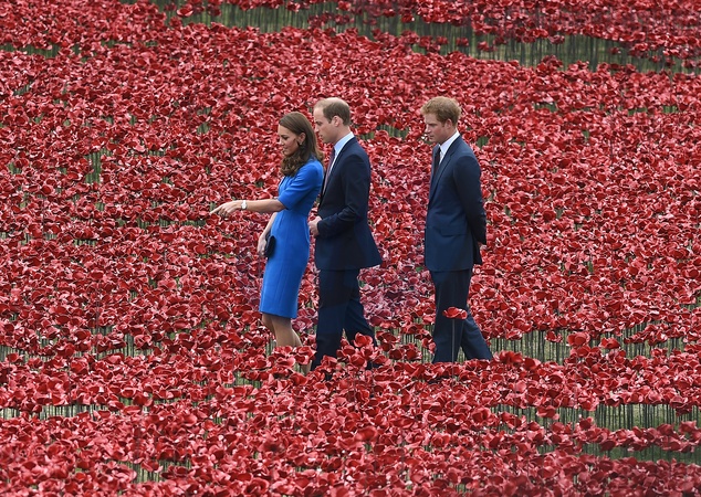 Ksiezna Kate, ksiaze William i ksiaze Harry wsrod ceramicznych makow przy zamku Tower