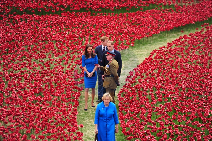 Ksiezna Kate, ksiaze William i ksiaze Harry wsrod ceramicznych makow przy zamku Tower