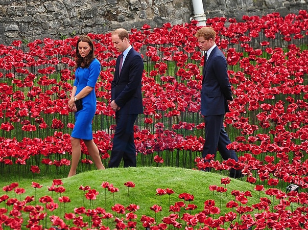 Ksiezna Kate, ksiaze William i ksiaze Harry wsrod ceramicznych makow przy zamku Tower