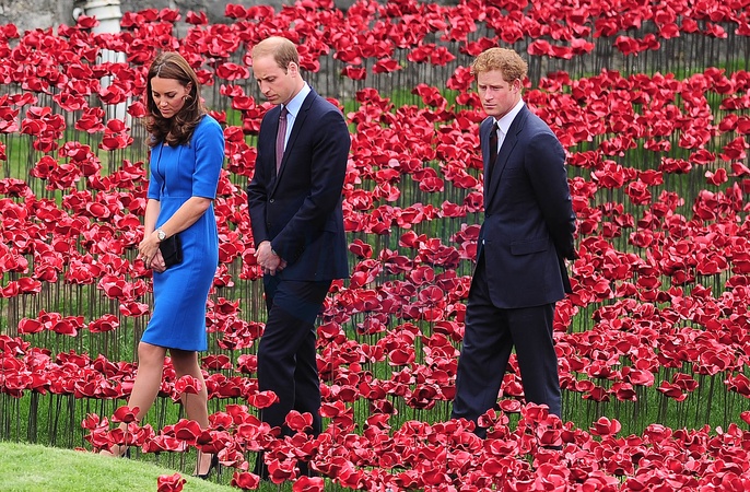 Ksiezna Kate, ksiaze William i ksiaze Harry wsrod ceramicznych makow przy zamku Tower