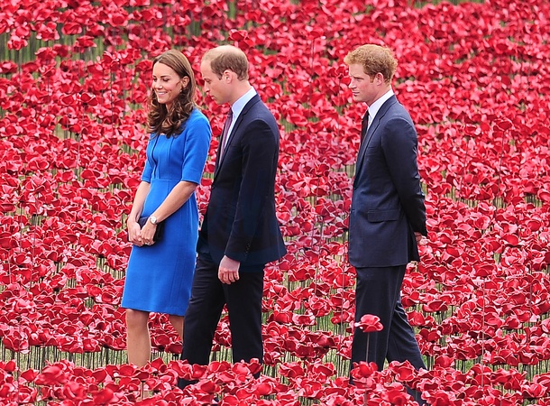 Ksiezna Kate, ksiaze William i ksiaze Harry wsrod ceramicznych makow przy zamku Tower