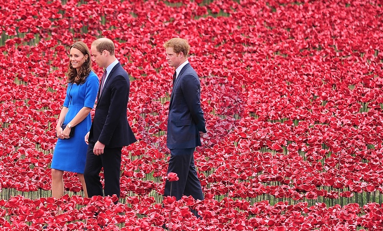 Ksiezna Kate, ksiaze William i ksiaze Harry wsrod ceramicznych makow przy zamku Tower