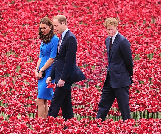 Ksiezna Kate, ksiaze William i ksiaze Harry wsrod ceramicznych makow przy zamku Tower
