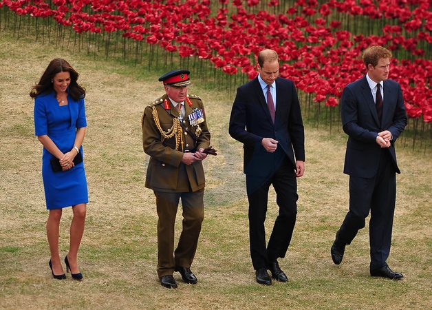 Ksiezna Kate, ksiaze William i ksiaze Harry wsrod ceramicznych makow przy zamku Tower