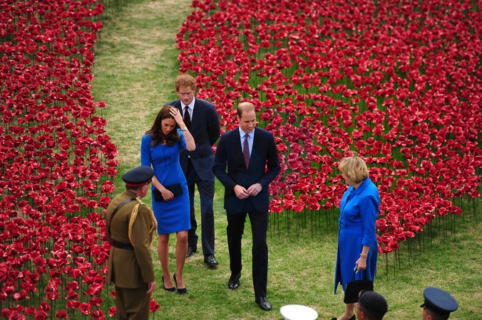 Ksiezna Kate, ksiaze William i ksiaze Harry wsrod ceramicznych makow przy zamku Tower