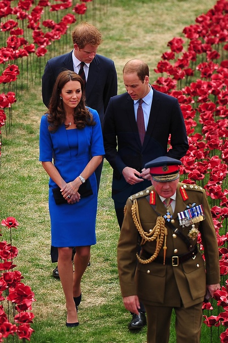 Ksiezna Kate, ksiaze William i ksiaze Harry wsrod ceramicznych makow przy zamku Tower