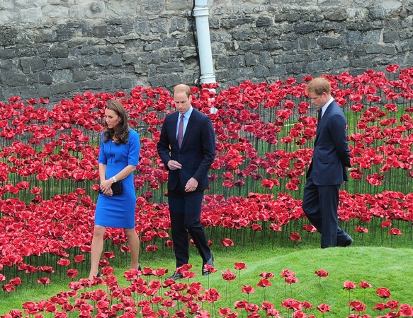 Ksiezna Kate, ksiaze William i ksiaze Harry wsrod ceramicznych makow przy zamku Tower